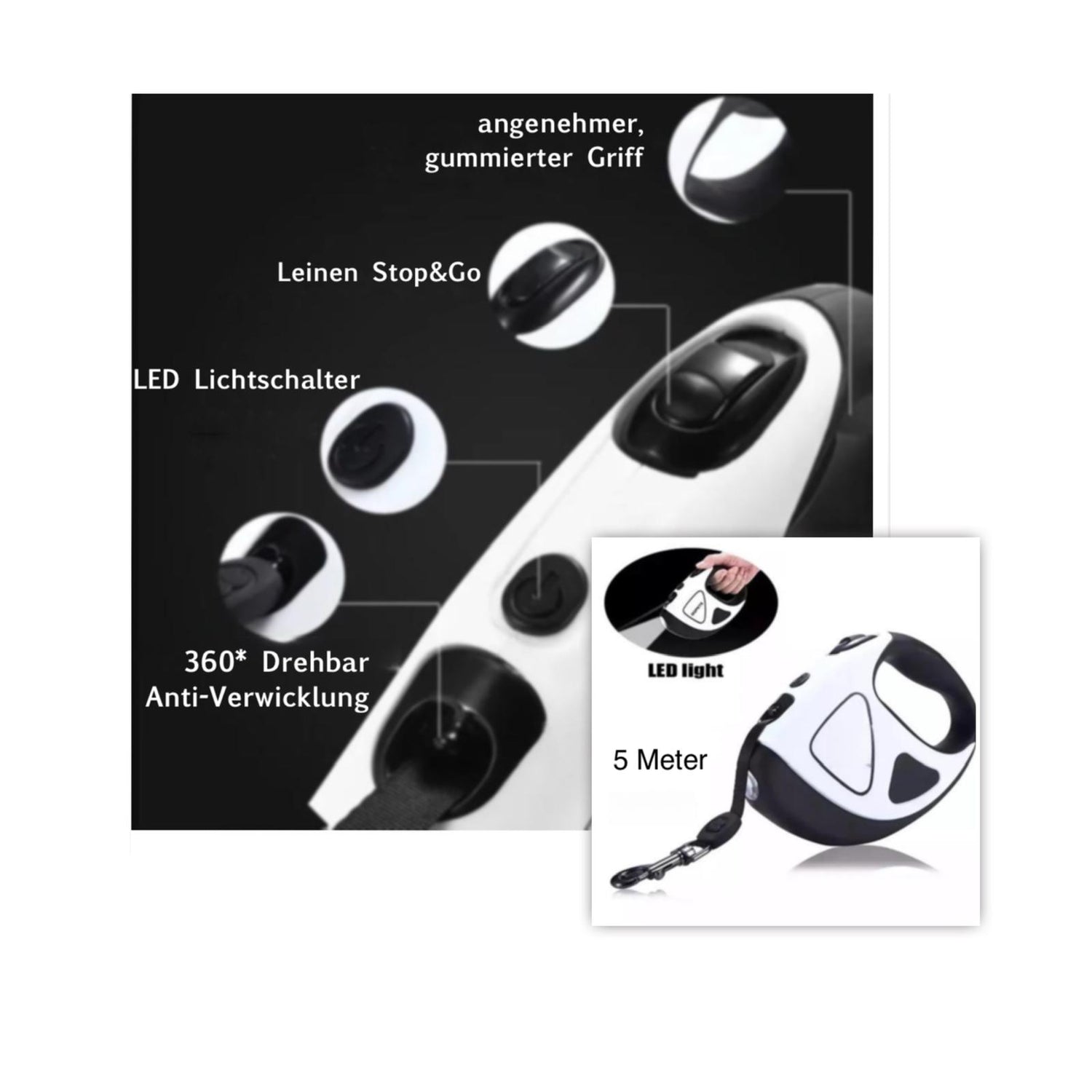 Unsere moderne Hundeleine ist so gestaltet, dass sie bequem in der Hand liegt und eine einfache Bedienung der Taschenlampe ermöglicht, ohne dass Sie die Leine loslassen müssen. Die Auswahl an Farben ermöglicht es Hundebesitzern, ihre Leine an das Geschirr oder die Halsbänder ihrer Hunde anzupassen, was ein harmonisches und stilvolles Gesamtbild schafft.